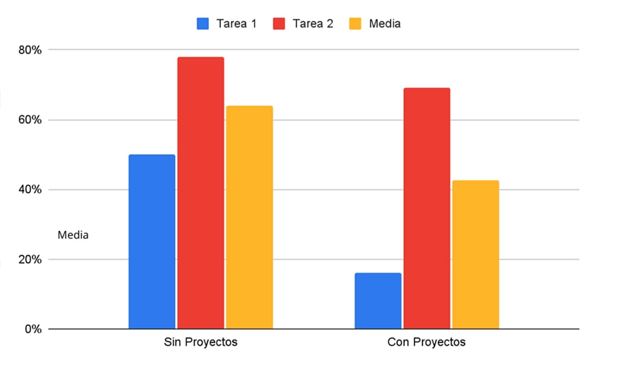 A partir del análisis, una hipótesis fue que incluir «Proyectos» y «Productos» en el menú principal generaría confusión. Para validarla, realicé un Tree Testing con 72 participantes en dos grupos. Los resultados: El grupo que navegó por el árbol sin «Proyectos» en el menú principal tuvo una tasa de éxito entre las dos tareas del 64%, mientras que el otro grupo solo alcanzó un 43%. Los usuarios con más opciones se sentían con «demasiados caminos posibles», y sus comentarios confirmaron que las opciones estaban basadas en la organización interna de la empresa, no en sus necesidades.