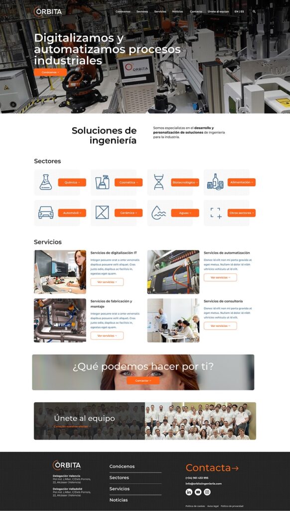 El objetivo principal de este proyecto fue rediseñar la web corporativa de Órbita Ingeniería para simplificar su contenido, adaptarlo a la estrategia de negocio actual y mejorar la experiencia del usuario. El cliente transmitía que recibía muy pocos contactos a través de la web y quejas sobre el bajo rendimiento. Mi rol fue liderar la investigación, el diseño y la estrategia de contenido para aumentar la tasa de conversión y mejorar la usabilidad del sitio.